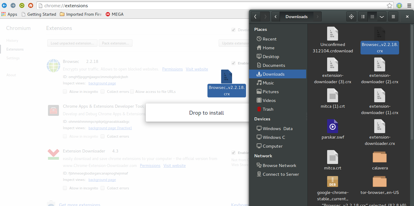پس از دانلود، به محل ذخیره افزونه یا برنامه خود بروید و آن را به درون کروم بکشید و رها کنید، دقت کنید حتما به صفحه ی Extensions به آدرس chrome://extensions/ بروید و بعد آن را بکشید.